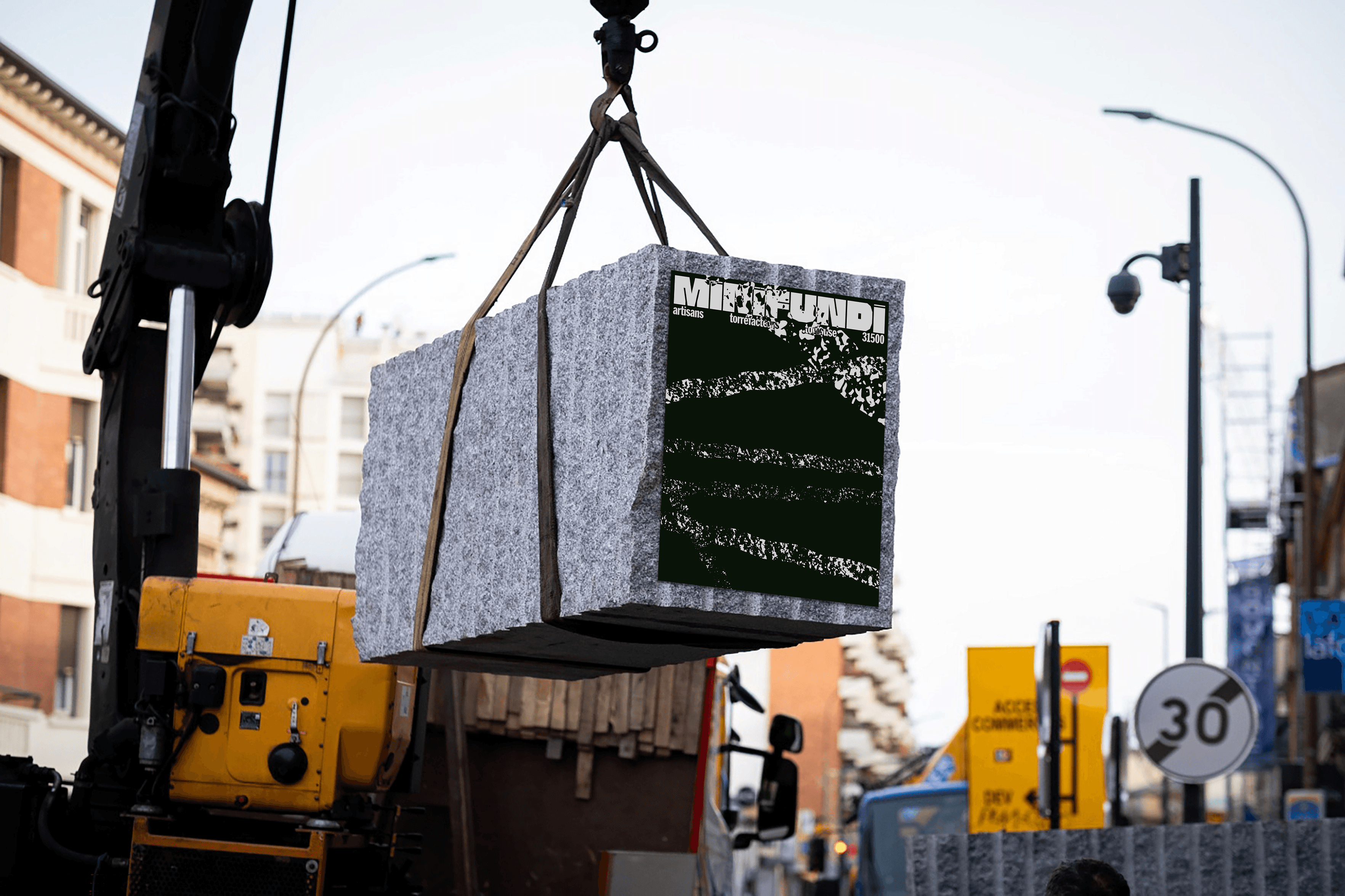 Le projet s’articule autour d'un logo existant, enrichi d’une direction graphique inspirée par l’architecture brute du lieu et ses blocs de granit. L’approche privilégie une esthétique texturée et industrielle, traduisant l’authenticité des matériaux par des jeux de formes géométriques radicales. Le projet a été sélectionné par le studio et le client pour sa fidélité à l’esprit du lieu et sa force d'impact visuel.